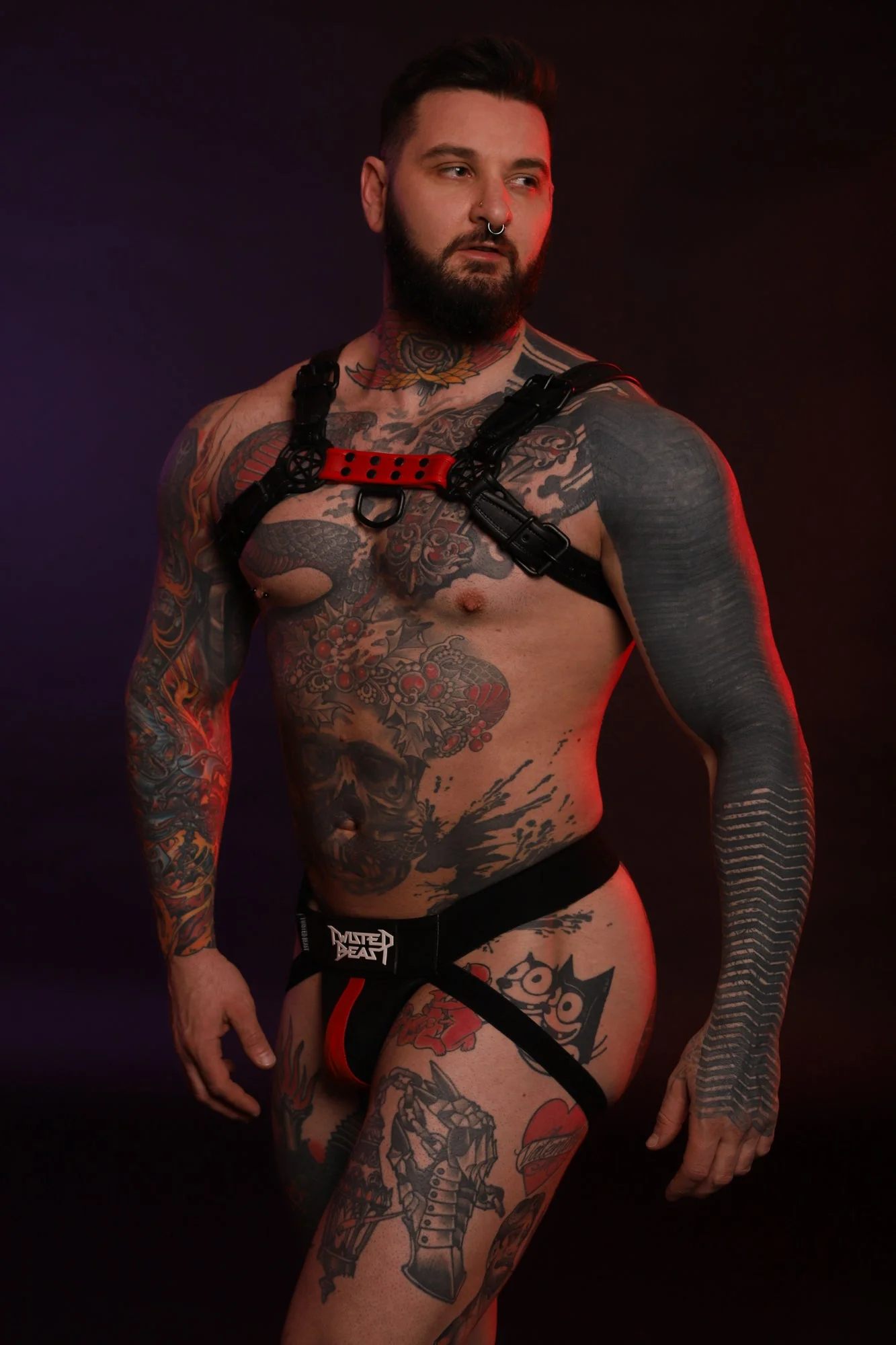 This Beast combo pack contains a top-of-the-line Beast Harness and a Beast Jock made of premium leather. Machined with custom pentagram o-rings, this black & red harness is both comfortable and reliable. The Beast Jock comes with a thick waistband and luxury silicone branded tag. The pouch is super soft and moulded to your body.